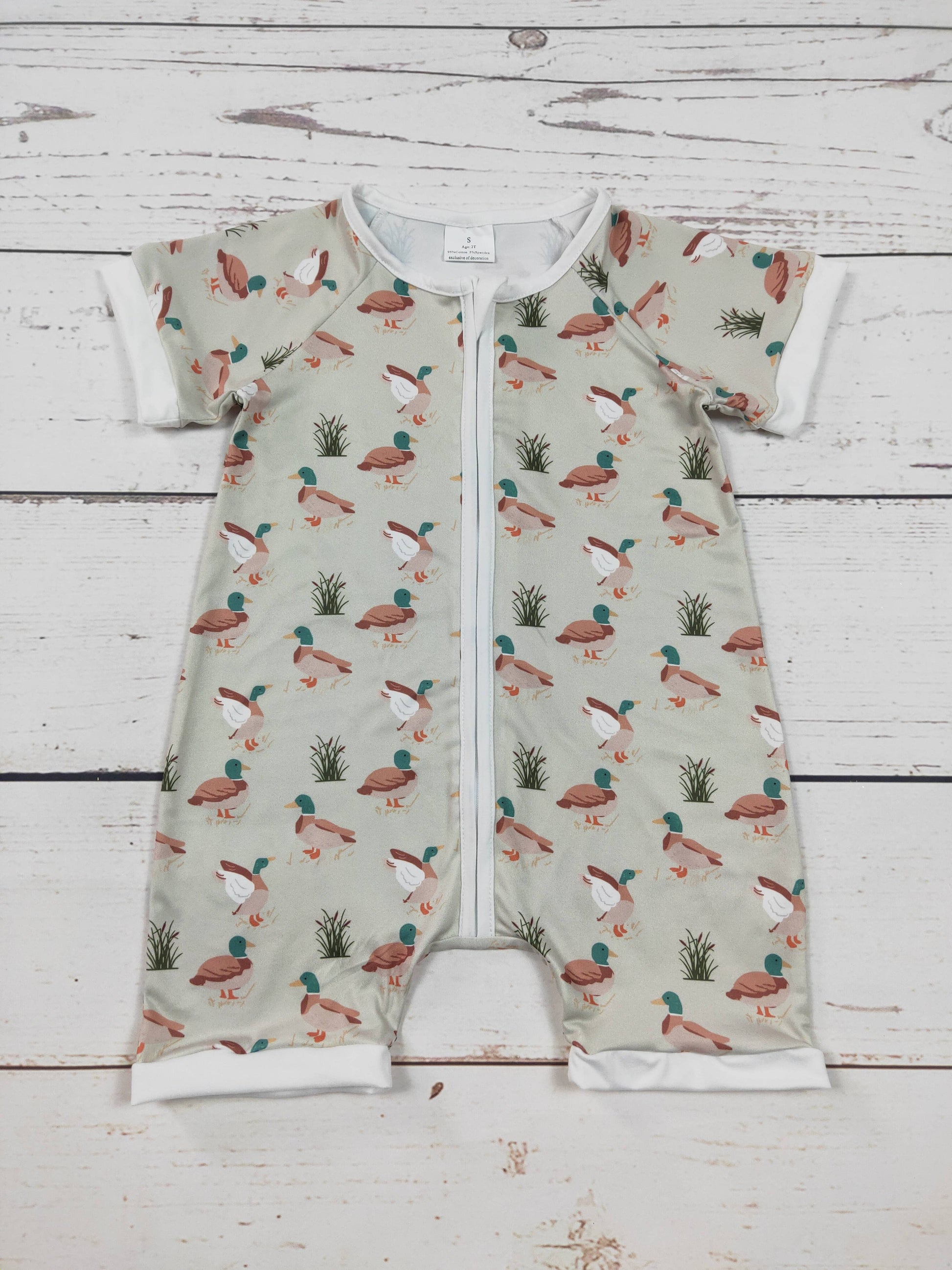 Baby Boy Duck Printed Zip Romper-With its adorable duck print and convenient zip design, this romper is the perfect choice for any stylish baby boy. Material is polyester