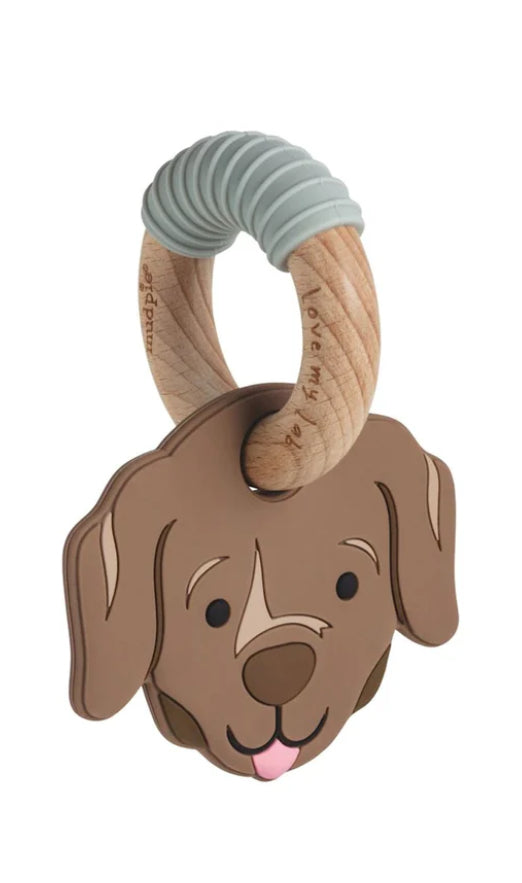 Soothe sore gums with this adorable puppy-shaped teether, thoughtfully designed for little hands and tender mouths. Made with a smooth natural wooden ring and soft, textured silicone, it provides gentle relief during teething while encouraging sensory exploration.